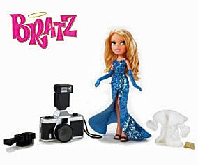 CLOE IN A BEAUTIFUL SPARKLING BLUE FORMAL WITH ELBOW LENGTH GLOVES,WHITE FUR TRIMMED COAT AND A 35MM CAMERA WITH 1 ROLL OF FILM..bratz cloe - movie star - with real working camera Features.